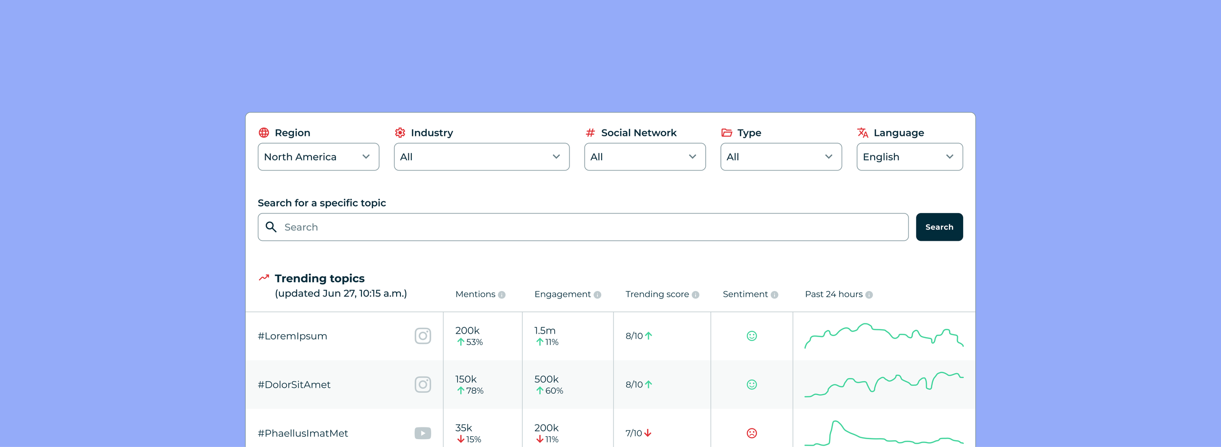 Allow users to filter the trends via Region, Industry, Social Network, Type, and Language